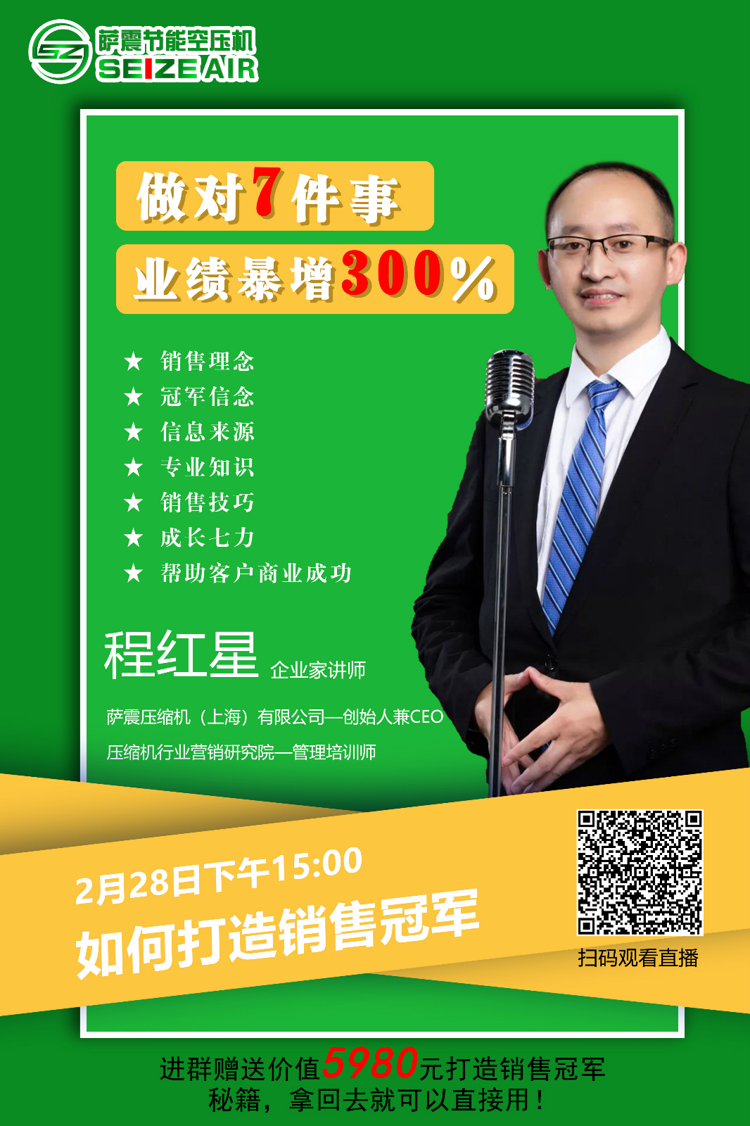 薩震節(jié)能空壓機(jī)程老師每天15點準(zhǔn)時開講《營銷創(chuàng)新的7大秘訣》,